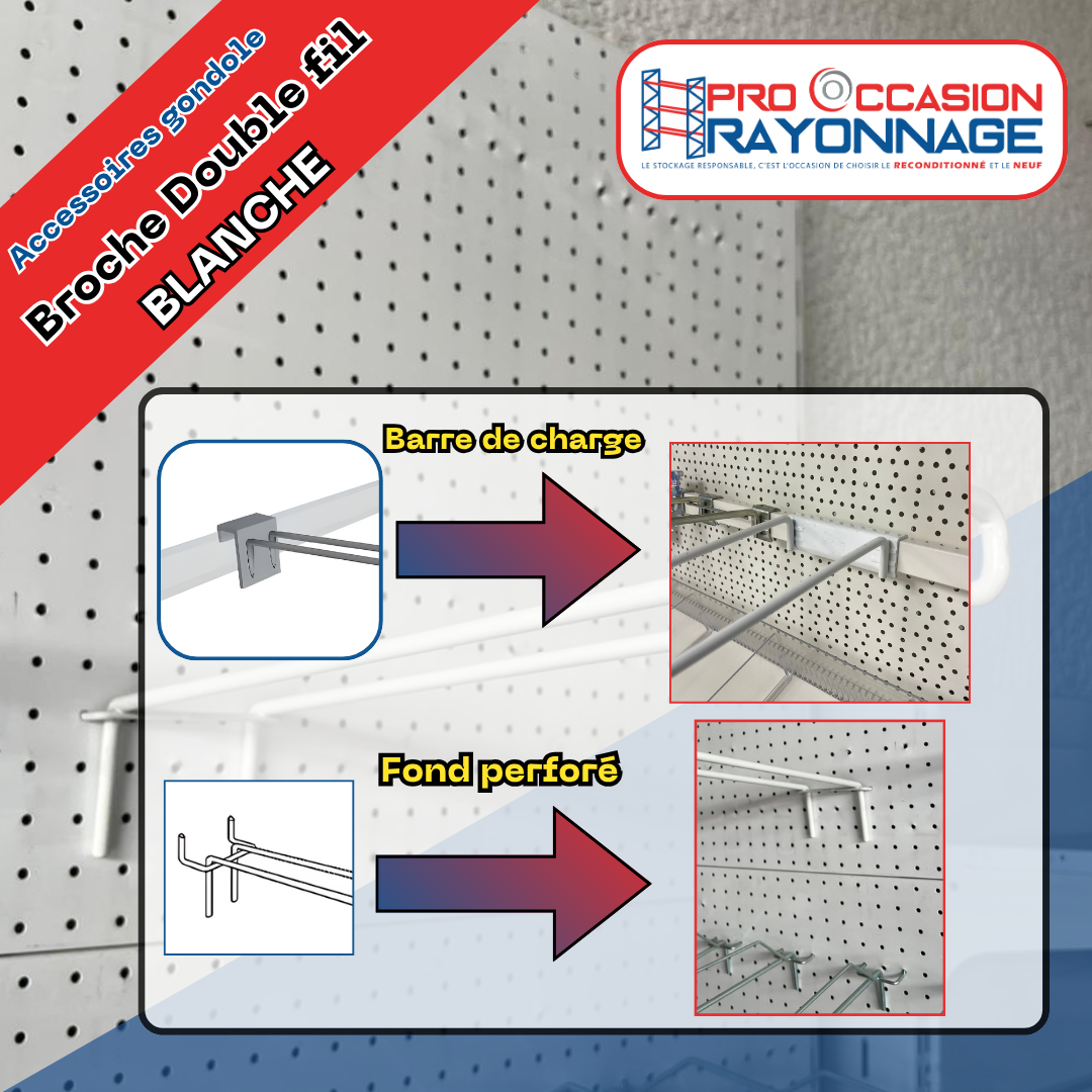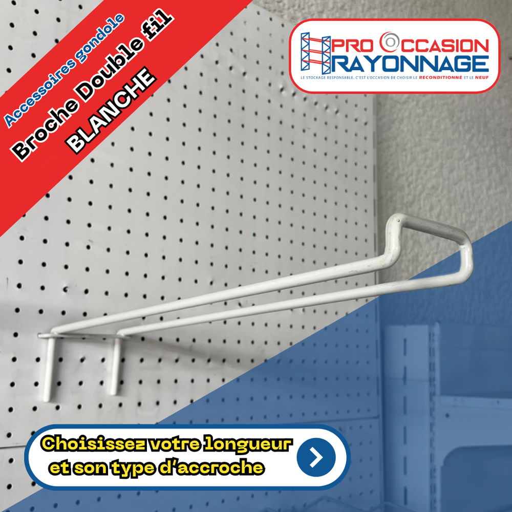 Chez Pro Occasion Rayonnage, nous accompagnons les professionnels dans l’aménagement de leurs espaces de vente. Nos accessoires, comme cette broche double fil blanche, sont pensés pour allier solidité, durabilité et esthétique, tout en facilitant le quotidien des utilisateurs. Avec notre sélection, vous bénéficiez d’un matériel de qualité professionnelle à prix compétitif.