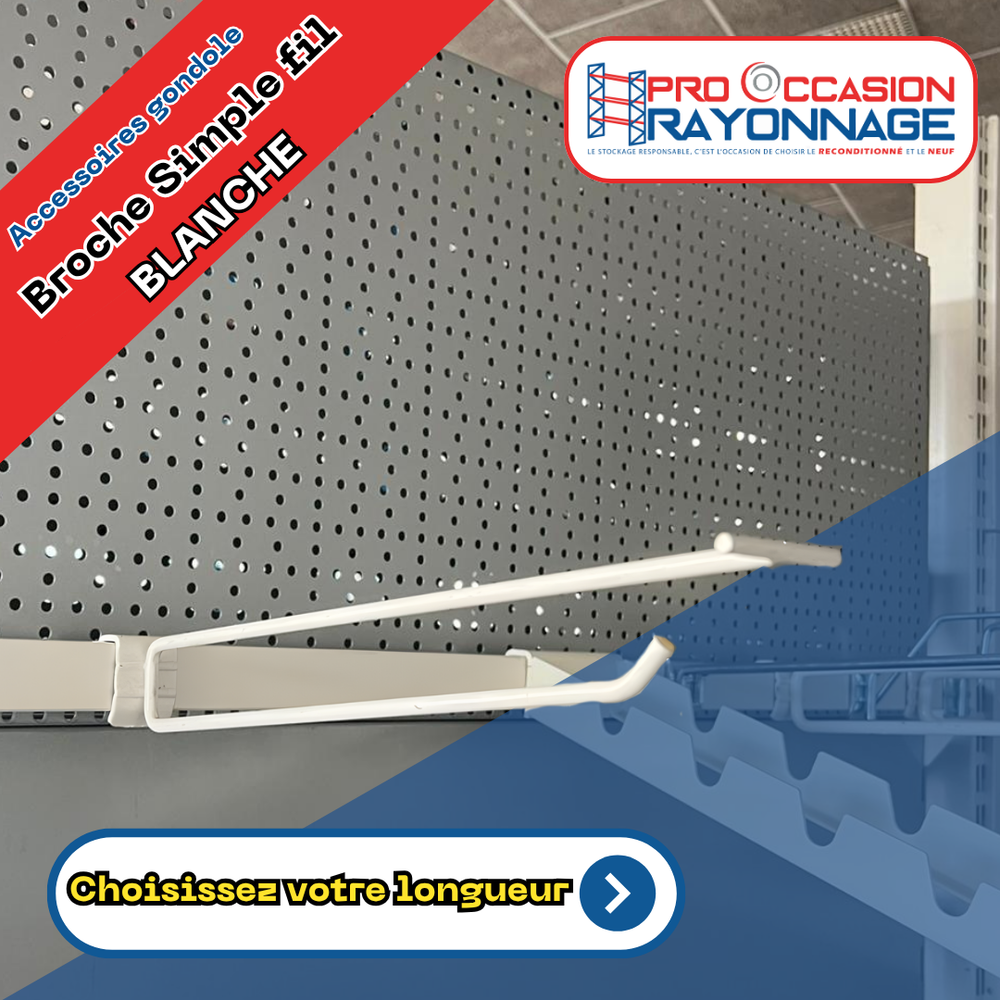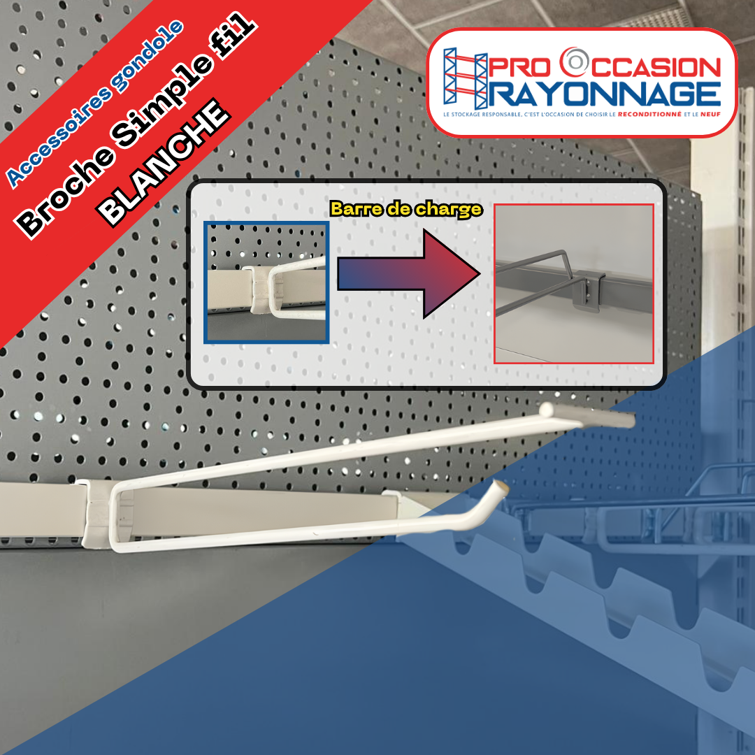 La broche simple fil blanche est l’accessoire parfait pour mettre en valeur vos produits sur gondoles équipées de barres de charge. Sa finition blanche apporte une touche sobre et moderne à vos rayonnages, tout en assurant une excellente visibilité des articles exposés. Légère mais résistante, elle offre une solution esthétique et fonctionnelle pour organiser vos présentations produits en magasin.