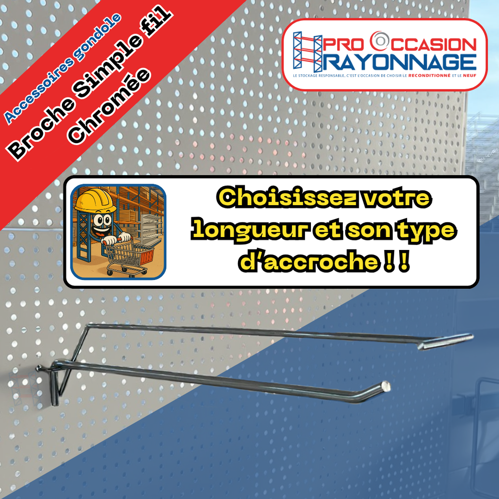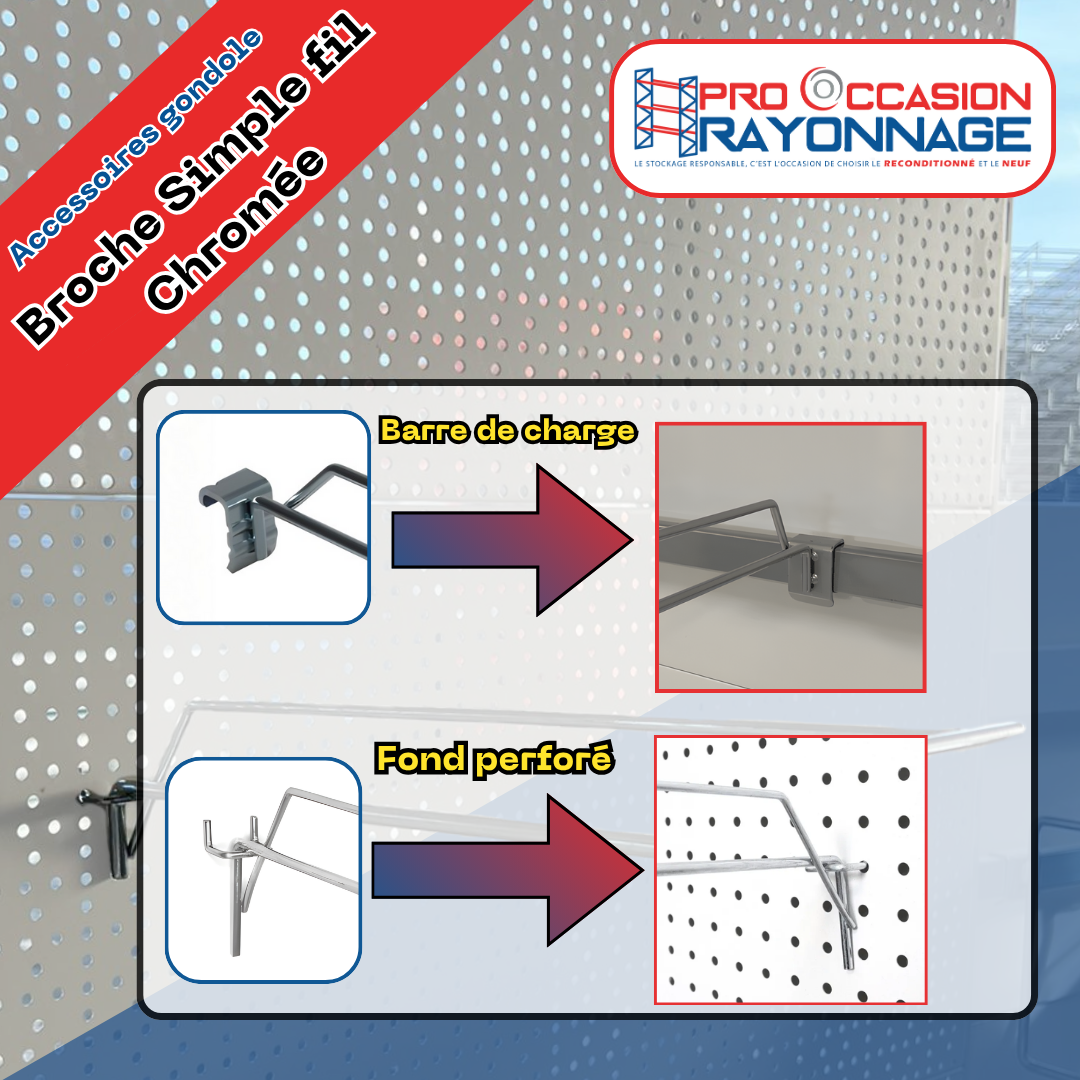Broche simple fils pour gondole de magasin - Couleur chromée, multiple type d'accroche