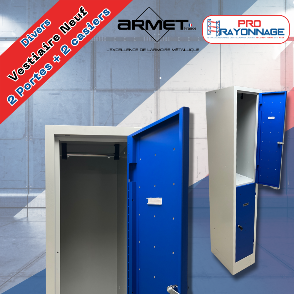 Voici le casier penderie Armet France, fabriqué par la marque qui équipe officiellement les Jeux Olympiques de Paris 2024. On est donc clairement sur du matériel solide et fiable. Ce modèle se compose de deux casiers superposés, chacun équipé d’une petite penderie avec une barre en acier galvanisé et deux crochets.