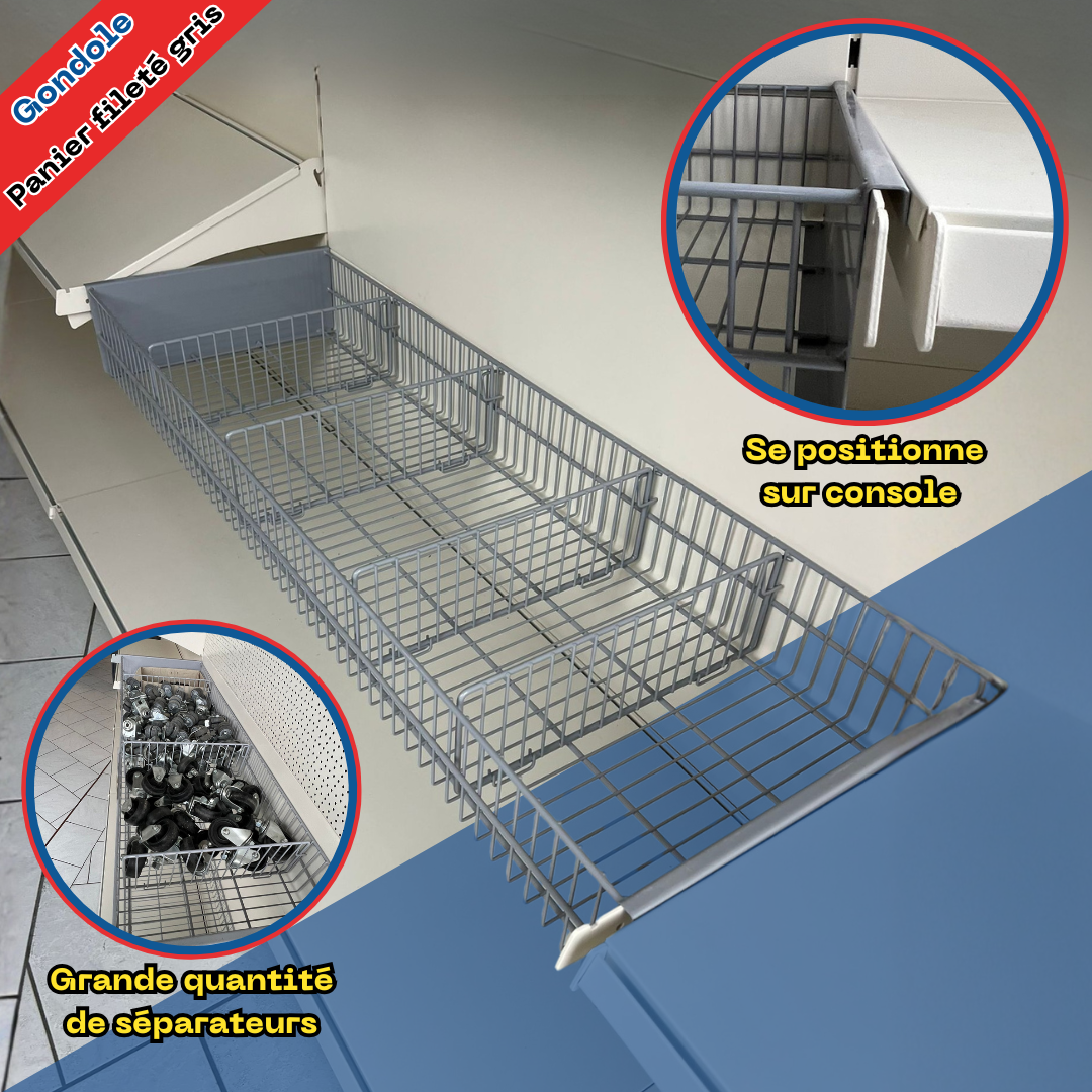 Ce panier métallique gris est une solution simple et efficace pour équiper vos gondoles de magasin et mettre vos produits à portée de main. Conçu pour être posé sur deux consoles, il s’intègre facilement sur la majorité des gondoles standards et permet de créer un espace de présentation pratique et accessible pour votre clientèle.