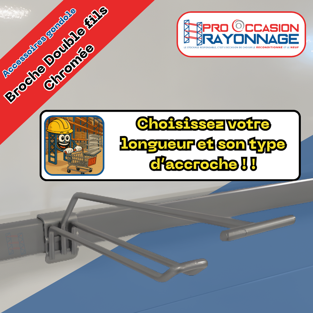 Broche double fils - chromée - pour gondole de magasin– plusieurs accroches et longueurs disponibles